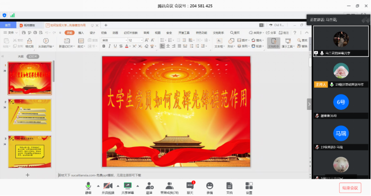 活动中,赵熠同志作了题为“初心如�、使命在肩”的微党课,提醒广大党员不忘初心、牢记使命,在抗“疫”中展现党员先锋模范作用;马兰花同志就“大学生党员如何发挥先锋模范作用”进行阐述,带头做出遵守法律法规、校纪校规的承诺;张玲萍同志向发展对象、积极分子详细介绍了“入党流程”,号召大家认真学习党章、积极服务社会、提高自身素质,争取早日向党组织靠拢�