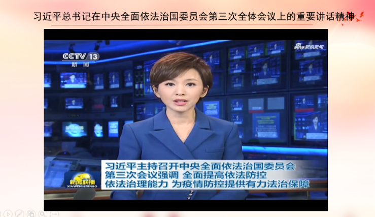 活动中,全体党员首先共同观看了习近平总书记在中央全面依法治国委员会第三次全体会议上的重要讲话精神的视频。随后,张刘倩玉同志带领大家学习了《中央全面依法治国委员会关于落实依法防控新型冠状病毒感染肺炎疫情切实保障人民群众生命健康安全的意见》精神。支部书记刘娇同志向党员、入党积极分子普及了新型冠状病毒肺炎疫情防控有关法律法规,分享了妨碍疫情防控的典型事例,号召大家深入学习疫情防控工作有关的法律知识,做知法懂法的大学生�