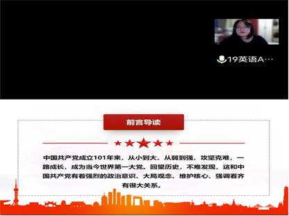 活动第四项,陶玉同学为大家讲解“党史视角下的四个意识”主题党课,从强烈的政治意识、大局观念、维护核心、强调看齐四个方面详细地说明了中国共产党自成立以来,从小到大、从弱到强、攻坚克难、一路成长,成为当今世界第一大党的过程。通过学习这次主题党课,同学们进一步提高了对中国共产党的思想认识,并且更加明白了身为一名党员要更加坚定信心,奋发有为,始终牢记为人民服务宗旨,以实际行动去恪守党的承诺,立足本职争当先锋,在疫情中为社会的发展和建设贡献自己的力量�