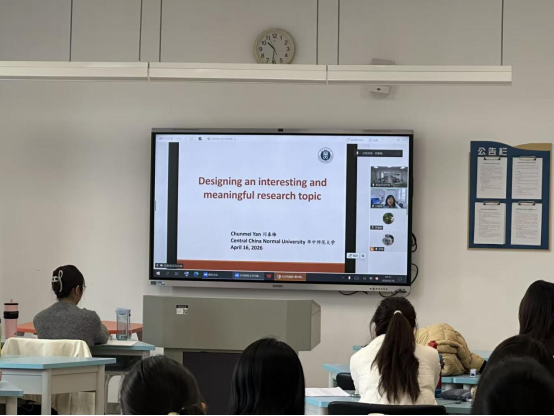 为树立正确的学术研究观,破解论文选题难题,提升外语教育领域的学术研究能力与论文写作水平,外国语学院于2026416日特邀华中师范大学闫春梅教授开展题为Designing an interesting and Meaningful Research Topic专题讲座。本次讲座由英语师范专业负责人、学科教学教研室主任李霞老师主持,外国语学院院长李增垠以及学院部分教师、2025级全体研究生共同参与了此次学习活动。
